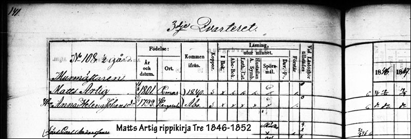 Matts Artig syntyi Paimiossa 16.8.1801, Matts Artigin ja Anna